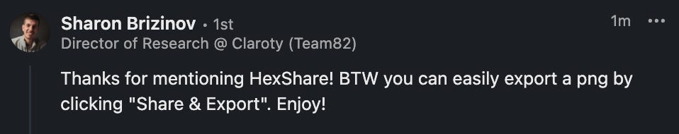Have you ever wanted to share a hexdump in a presentation or during a CTF, and struggled to highlight a subsection that is critical to whatever your finding is? Look no further! This is a neat website where you can upload a file, select a section of that file up to 1024 bytes, and use their playground to highlight different sections. You then mouse over the interesting parts and choose colors to magnify whatever you need to show. There are links to share the annotated hexdump., but I couldn't find an export feature for a PNG. A screenshot should be fine though.
