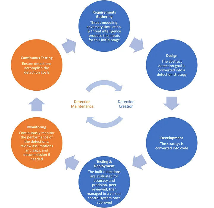 This “restoring focus” blog from Tsolakis provides a candid and insightful examination of the state of detection engineering from a rule maintenance perspective. The detection lifecycle’s fun part (IMHO) is on the right side of the equation, aka the blue circles (shoutout to Detection GOAT Haider Dost)