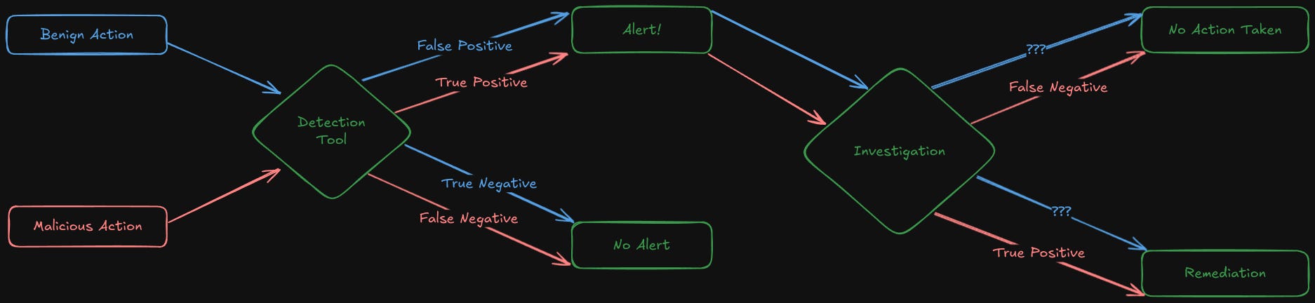 What you see above is Taggartās approach to the usefulness or efficacy problem in Detection Engineering. Itās somewhat of a homage to One-shot games, with the idea that you perform one action-to-investigation traversal per alert. However, note that the outcomes arenāt TP/FP/TN/FN labels; instead, they are actions taken after an investigation. This framing makes it much easier for detection teams and leadership to understand the value of alerts, rather than relying on ratios and MITRE coverage.