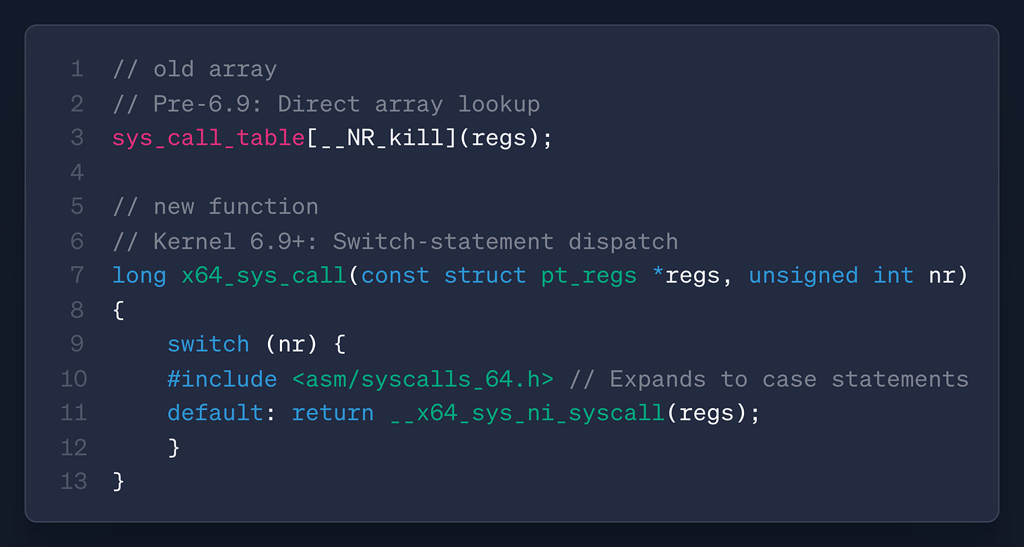 Line 10 is the change that killed rootkits like Diamorphine. This is where flipswitch comes in.