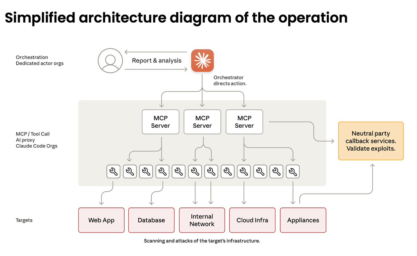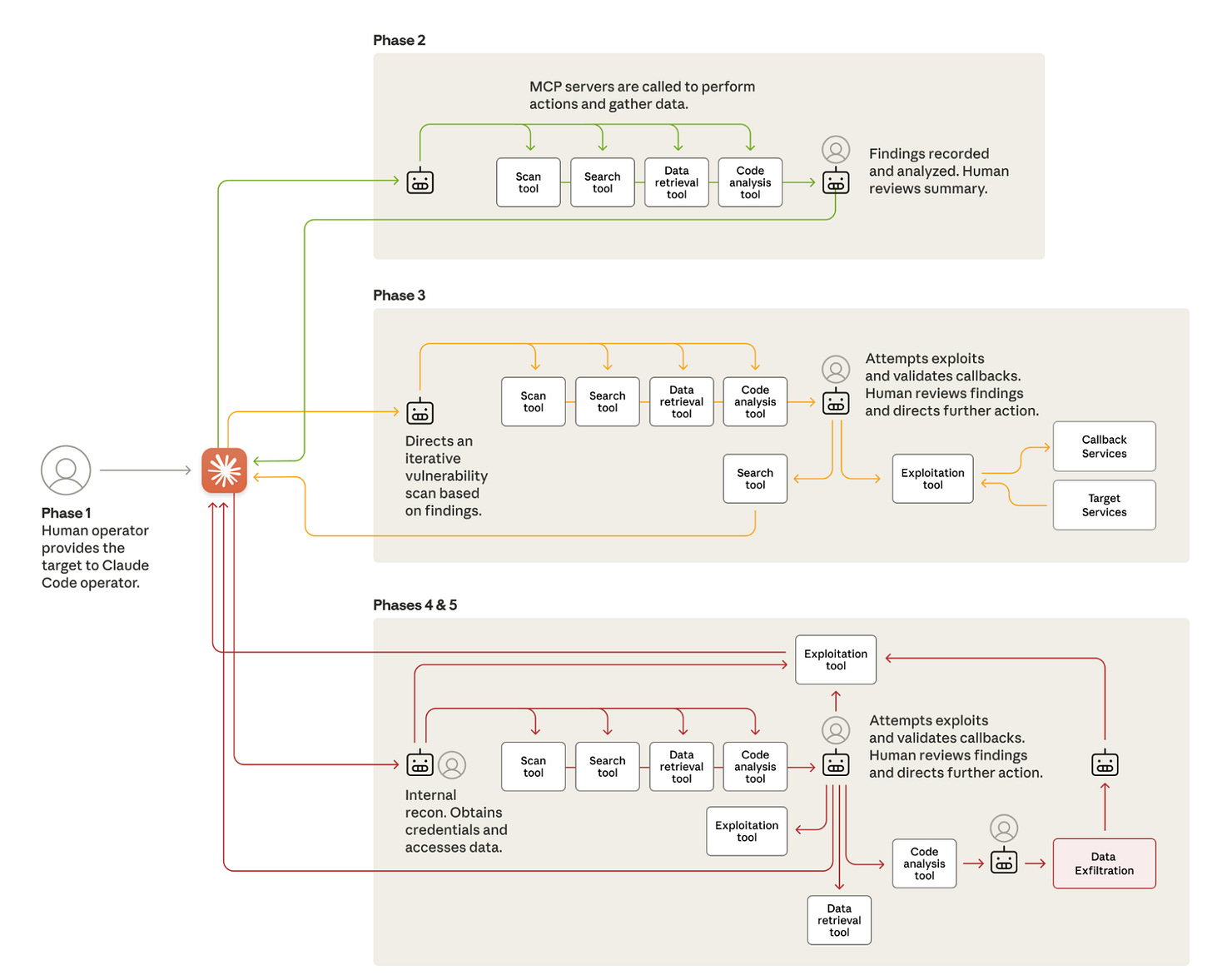 Anthropic grouped their attack operations into five phases, as shown above. The “robot” in each phase serves as the MCP server, directing specific tools to perform tasks along the ATT&CK killchain. The human icon next to the robots indicates a manual validation step by a human. These pit stops serve as a verification step to make sure that Claude is behaving correctly and not hallucinating.