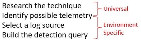 I do see a lot of similarity with MITRE ATT&CK’s recent v18 launch, specifically Detection Strategies. “Identify possible telemetry” is, in general, where Detection Strategies stop and TRR reports begin. Log sources are environment-specific, and although you may have Sysmon, EDR, or syslog logs, they can become nuanced based on your environment setup. For example, a CrowdStrike vs. SentinelOne query will affect your log source query.