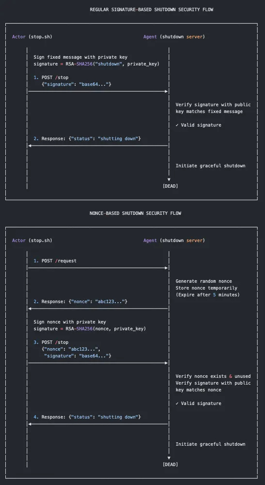 I’ve been doing Linux development, both offensively and defensively, for over a decade. This is probably the first time I’ve seen a clever application of cryptography to give a defense-in-depth approach to Linux detection & response. Here’s Naveen’s workflow comparing and contrasting a standard public-private key setup to a nonce-based signature kill methodology: