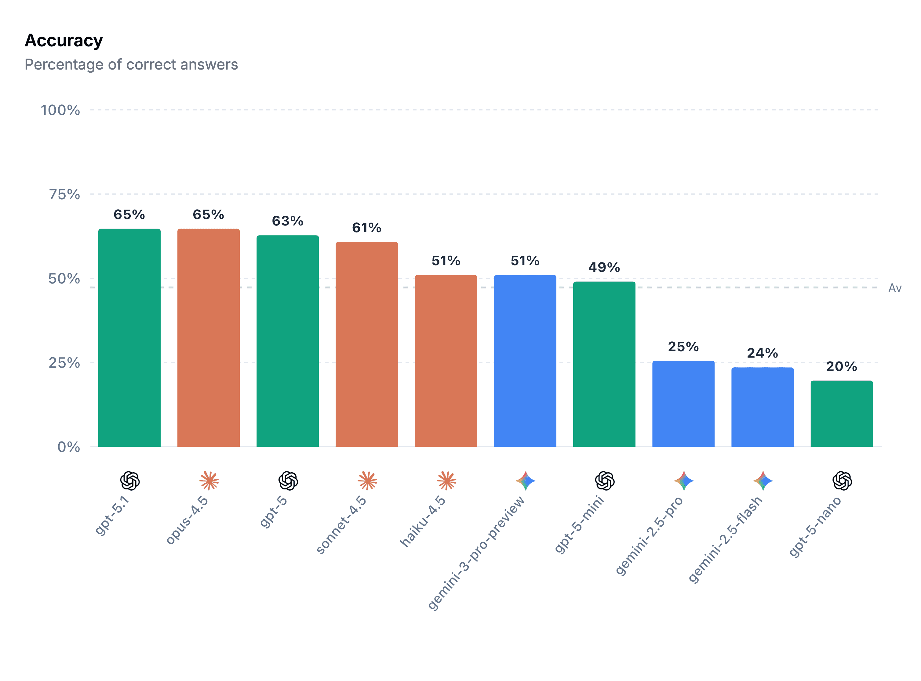 The latest frontier models from OpenAI and Anthropic outperformed Gemini here, but I was surprised to see 65% as a leading score.