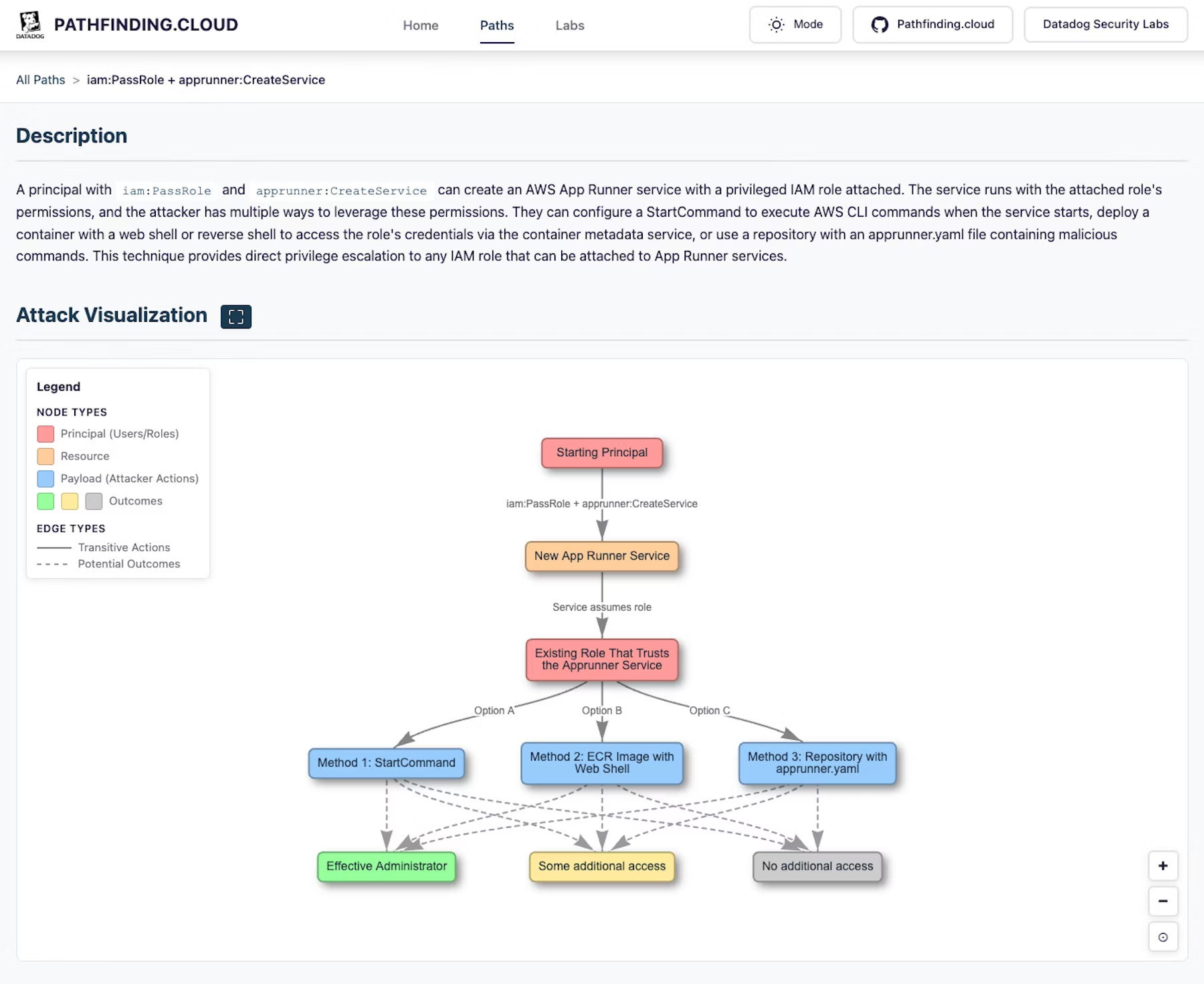 Seth recently released a comprehensive library on privilege escalation scenarios and techniques abusing IAM in AWS environments. There are 65 total paths, and 27 of them are not covered by existing OSS tools to test coverage. That good news is that the website has the description of each attack and how to perform it, as well as a helpful graph visualization so you can see the traversal rather than try to create an image in your head.