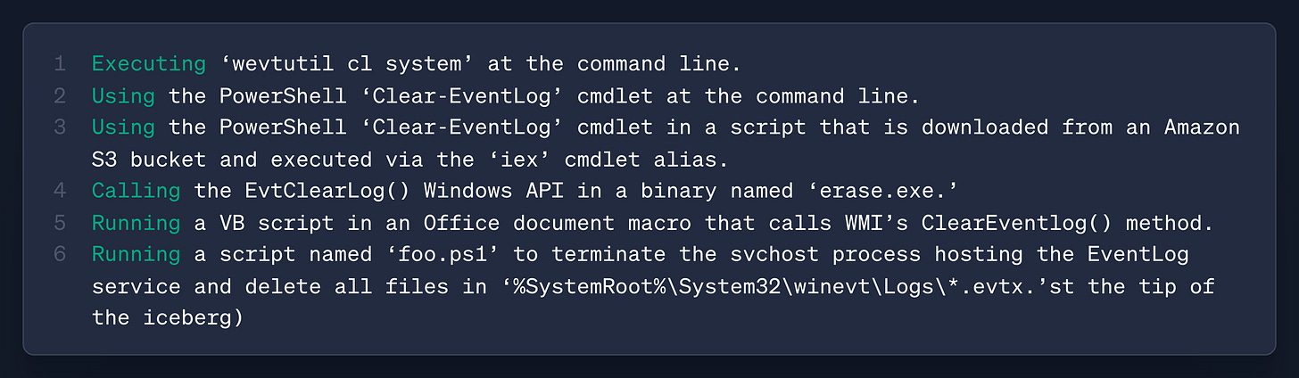 ATT&CK does get close to this via Detection Strategies. As an example, VanVleet looks at T1070.001, Indicator Removal: Clear Windows Event Logs. The MITRE page includes a description of how this can be achieved, but it seems high-level enough that some more detail on the recipe would be helpful. The detection strategy can provide more clues from an event-ID perspective, but without the technical implementation, it may be hard to recreate and test. Hereās his idea of what an Instance section could look like:
