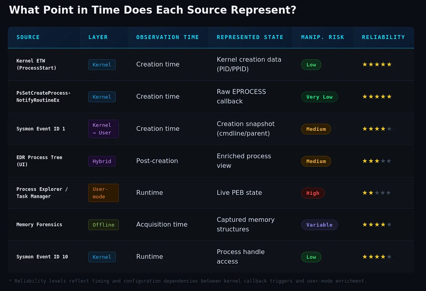 This manipulation relies on the time at which the telemetry is observed. As soon as the PEB metadata surfaces in a user-mode context, it can be hooked and modified to evade defenses. I thought this block was useful to understand the timing problem: