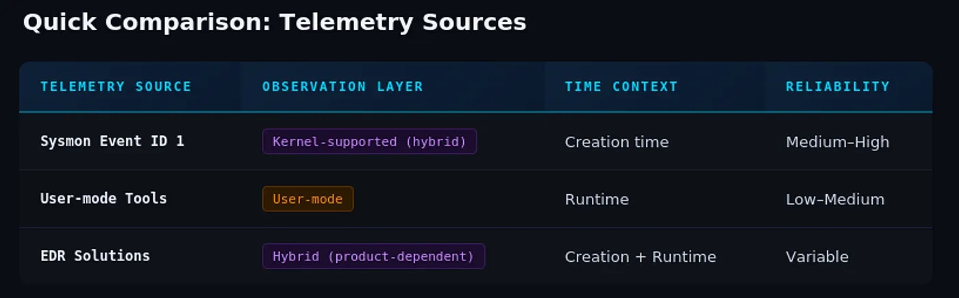 An example of this concept, according to Kess, is comparing telemetry sources for Process Creation. He outlines 3 sources: