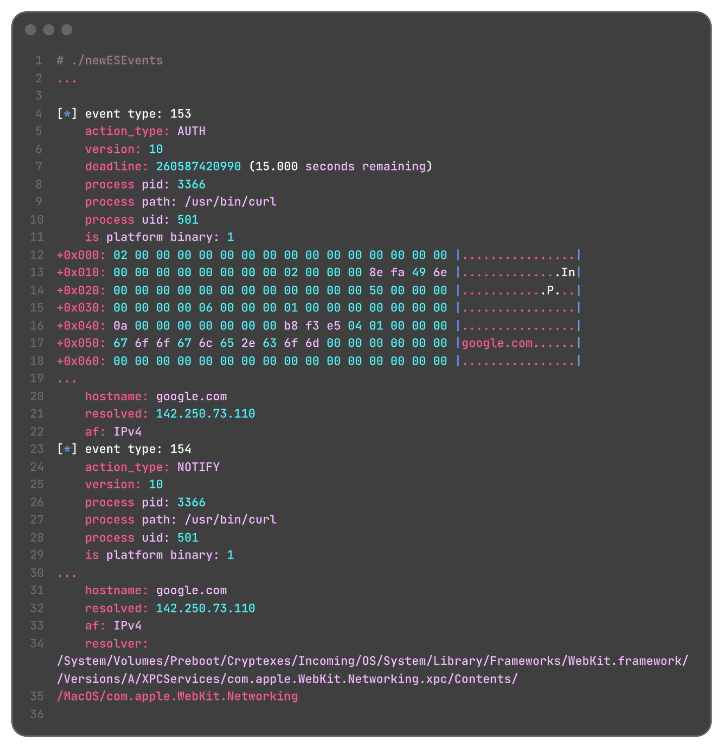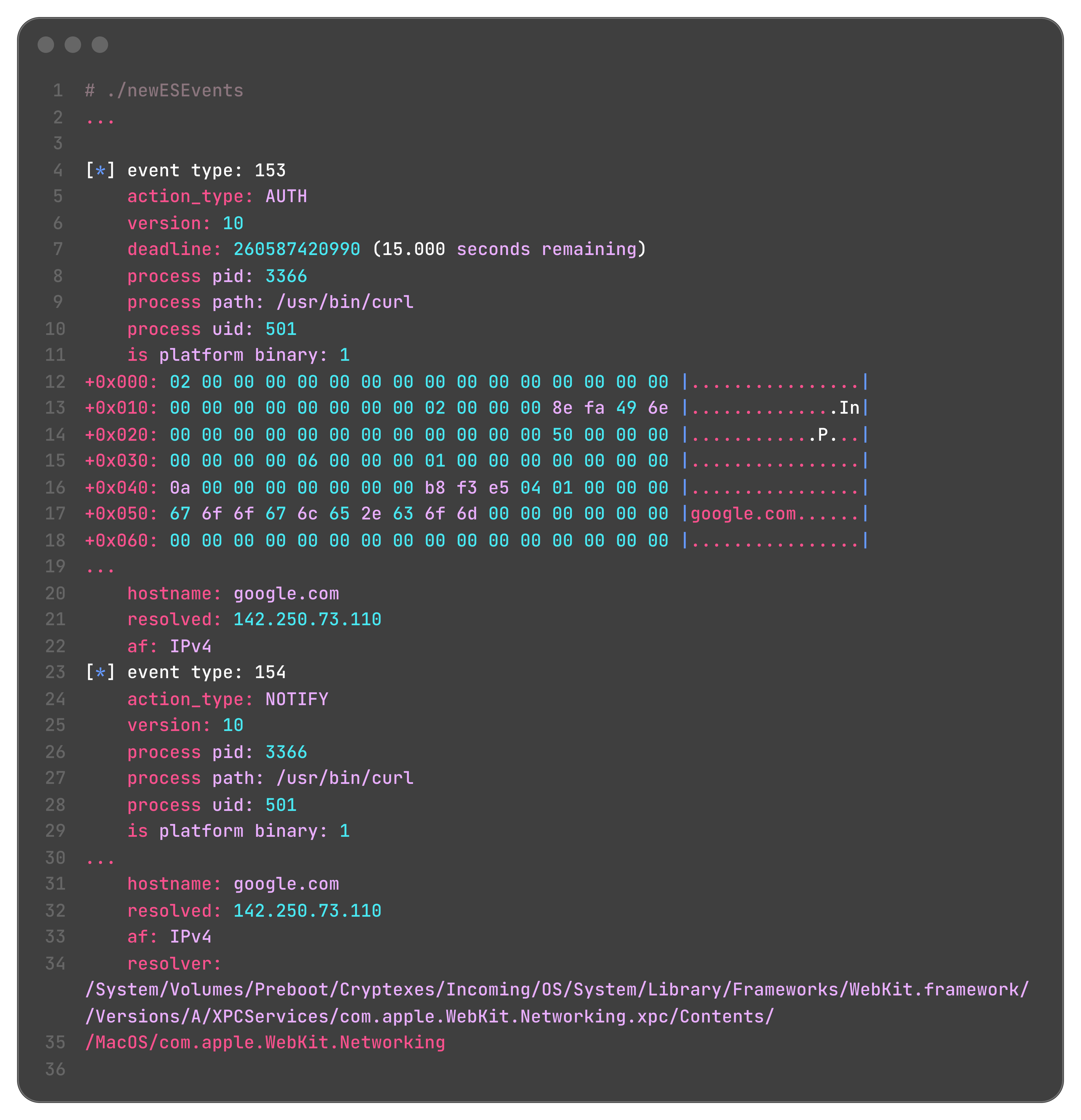 So, Wardle built a harness to subscribe to the Endpoint Security event stream and filter out the event types listed above. He sucessfully subscribed to 3-6, and had such a clever way to print the raw bytes from these subscribed events into essentially what is a hex dump. Instead of parsing each byte, he fed his methodology (plus the dumps) into Claude Code, and it found out they were network logs: