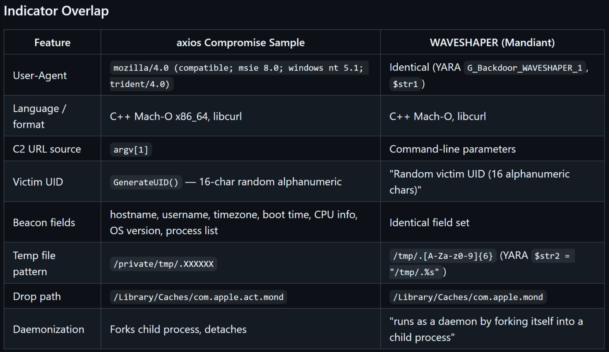This post from the Elastic Security Research team helps shed light on the malware payloads in the second stage of the Axios attack. They said that the RAT dropped on this stage shares a “significant overlap” with WAVESHAPER, a malware family tracked by Mandiant that is connected to a DPRK-linked threat cluster. I thought this was a helpful table to show the details of this campaign compared to WAVESHAPER data: