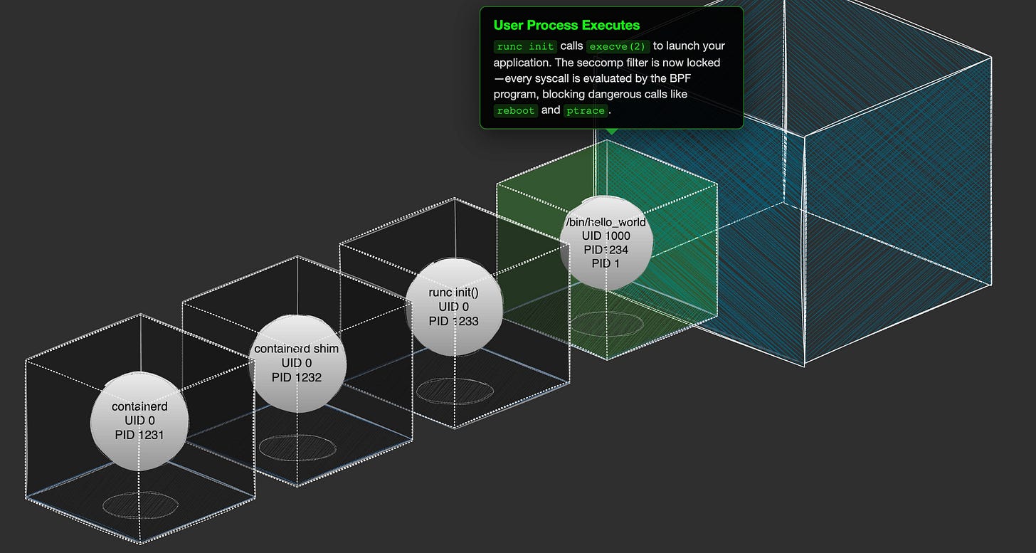 He’s got a sick Linux syscall table lookup with information on each syscall as well as labels around how you can abuse them. The interactive “how do containers work” demo is sick, too.