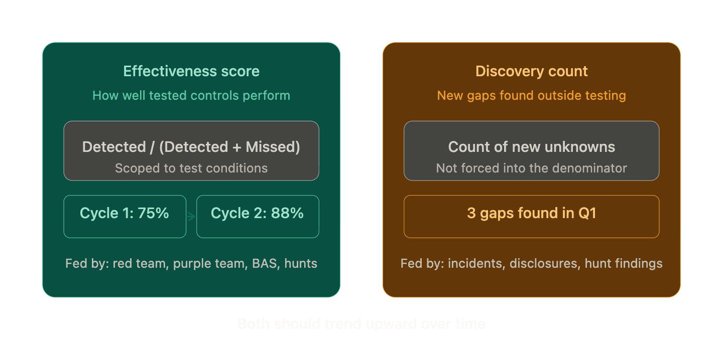 The discovery count stays separate on purpose. If you lump newly found gaps into the denominator, the more unknowns you surface, the worse your score looks. That creates a perverse incentive where teams stop looking for blind spots because finding them risks tanking the metric. Chen’s answer is simple: keep it as a standalone count. “3 new gaps discovered and addressed in Identity & Access this quarter.” Effectiveness tells you how well tested controls perform. Discovery tells you how much you’re still missing.